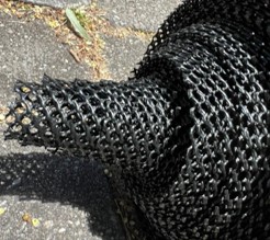 Use closely woven UV stabilized plastic leaf guard with a 4mm restrictive hole.